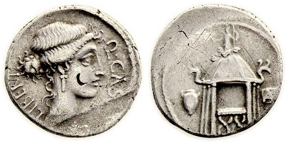 AR Denár, Hlava Liberty "LIBERT.Q.CASSIVS."/ kurulské křeslo v chrámu Vesty, nápis "A.C.", Crawford.428/2, Seaby.Cassia.8, Alb.1354, kontramarka, nedor., patina