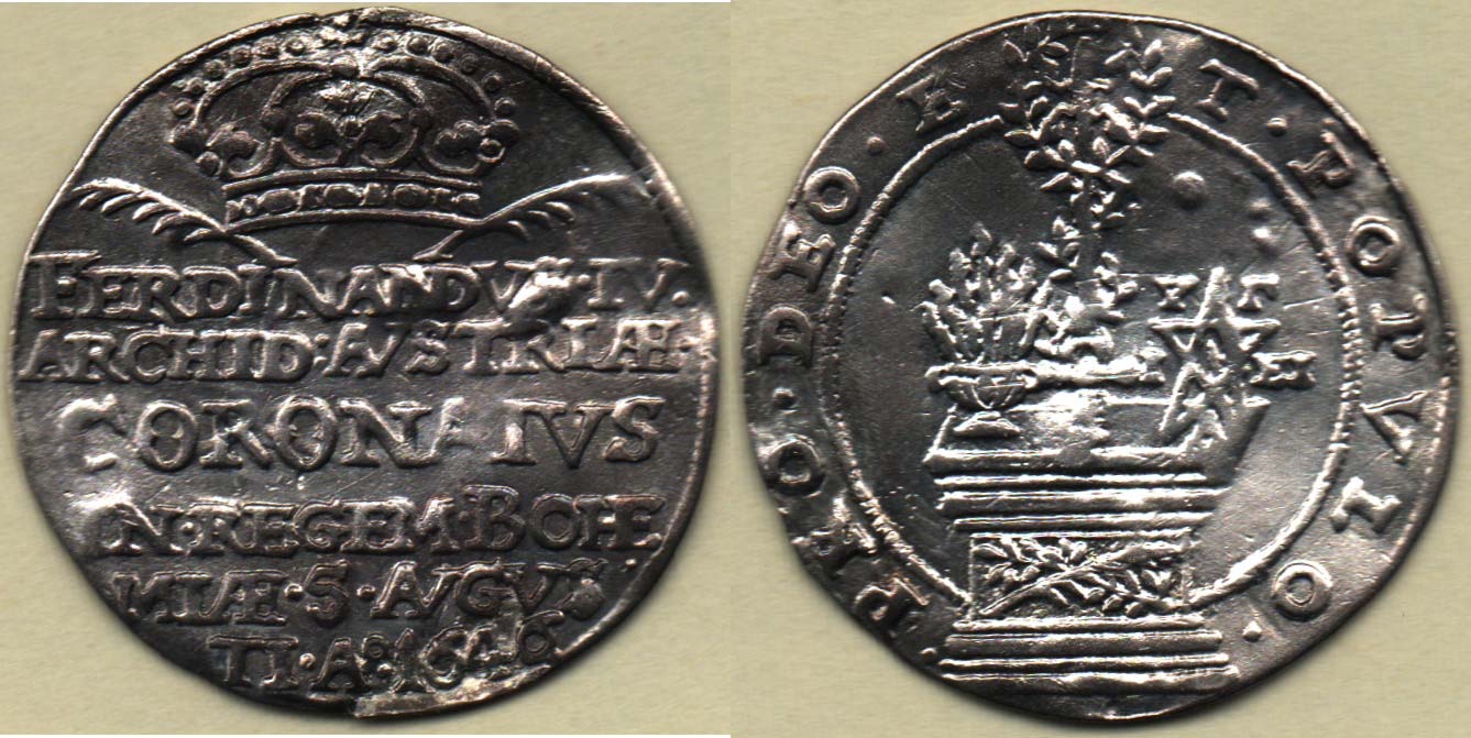 Velký jeton na korunovaci v Praze 5.8.1646 - oltář s hořícím kalichem, plam.mečem a hvězdou, opis / koruna a nápis, Ag 27mm, 2.713g, ČS.730, Nov.A.5b, m.o.,pat.