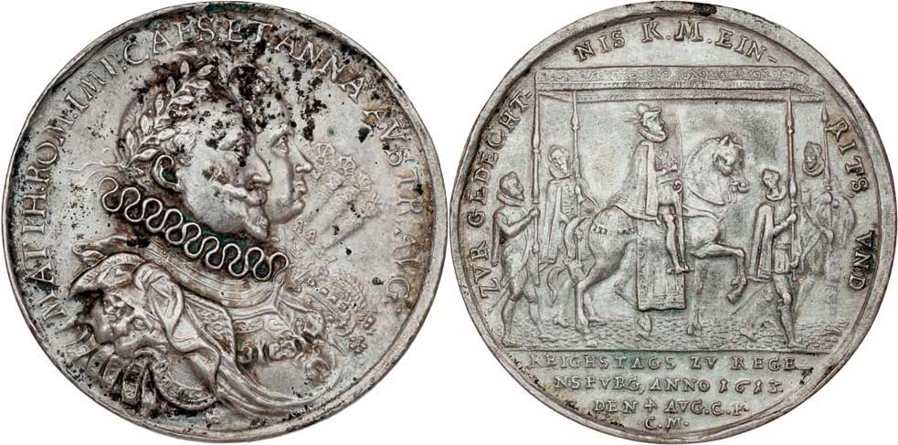 C.Maler - medaile na Říšský sněm v Řezně 4.8.1613 - dvojportrét zprava, opis / císař na koni, písmo, Sign., lité Ag 40mm, 21.100g, H.1433, skvrny, patina
