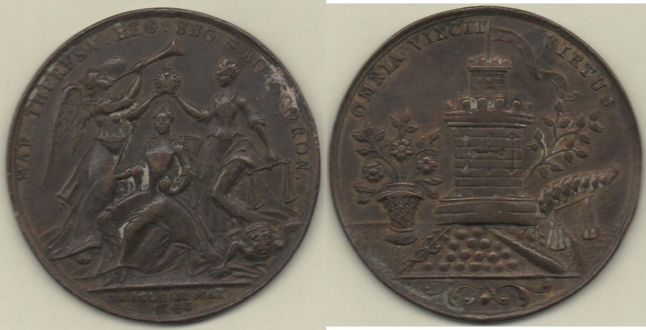 Lidová medaile na korun. v Praze 1743 - Spravedlnost a Fáma korunují královnu, opis a nápis / věž, symboly vítězství a opis, bronz 43mm, ČS.1319, dr.hr., patina