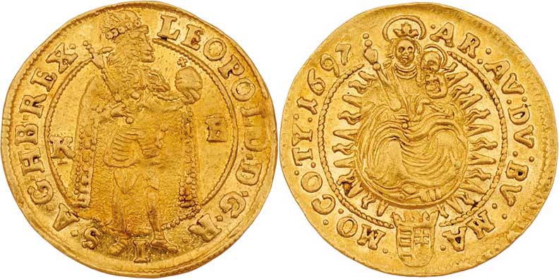 Dukát 1697 KB, Kremnica, Nech.1049, Husz.1322, 3.465g, nep.zvlněný, nep.hr., nep.rysky, pěkná pat.