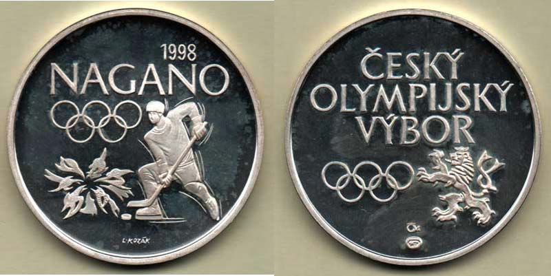 Český olympijský výbor - ZOH Nagano 1998 - český lev s olympijskými kruhy, nápis / květ, hokejista, nápis, Sign., Ag900, 31mm, 13.136g, nep.poškr.kapsle