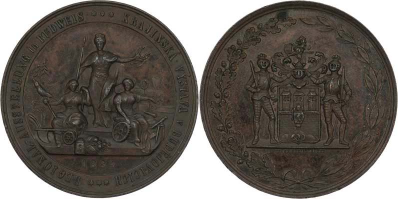 Christlbauer - Krajinská výstava 1884 - městský znak se štítonoši, věnec/ alegorie průmyslu a zemědělství, vročení, opis, Sign., bronz 44 mm, 33.490g, nep.hr.