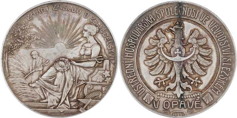 Karnet a Kyselý - Ústřední hospodář. společnost b.l. - slezská orlice, opis / sedící Silesia, muž sekající obilí, slunce, opis, Sign., Ag 51mm, 44.419g, patina
