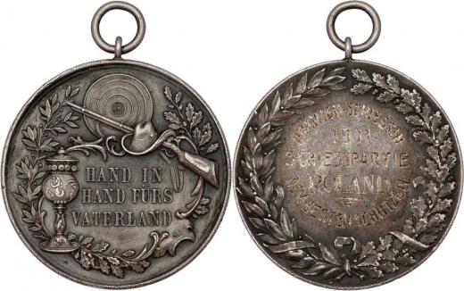 Roland 1911 - premiové střelby - puška, terč, pohár a 3-řádkový nápis / ve věnci 5-řádkový rytý nápis, Nesign., Punc. Ag990, 39mm, 22.658g, původní ouško