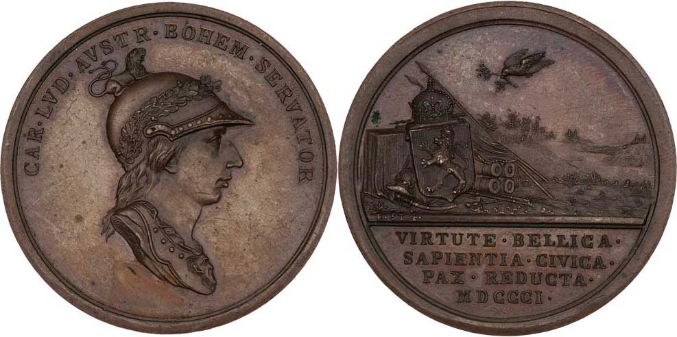 Guillemard - AE medaile na mír v Luneville 1801 - poprsí v antické přilbě, opis / český znak, holubice nad krajinou, 42mm, 33.945g, M.2327, PG.121, nep.rys.