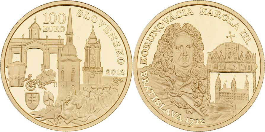 100 Euro 2012 - korunovace Karla III., KM.0-nové (Au900, 9.50g, pouze 7.000ks), kapsle, etue, karta, přebal, reklamní prospekt