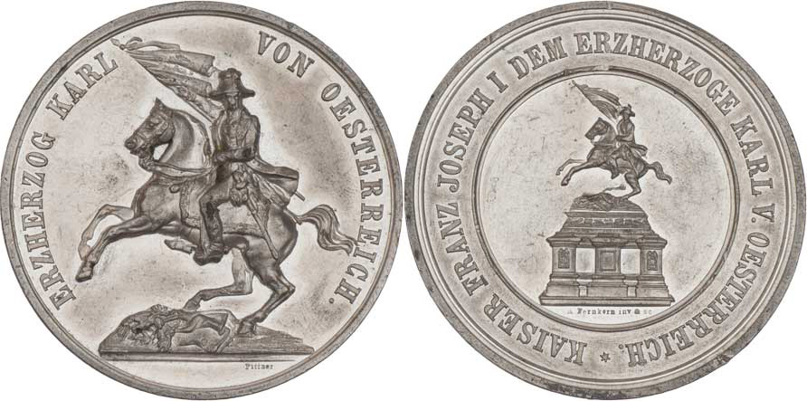 Pittner a Fernkorn - odhalení pomníku ve Vídni b.l. - arcivévoda na koni zleva, opis / jezdecký pomník, opis, Sign., cín 50 mm, napilovaná hr., nep.rysky R!