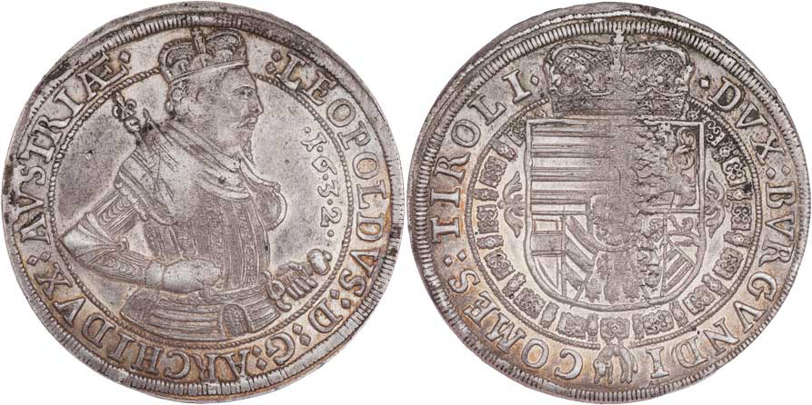 Tolar 1632, Hall, M-A.129, KM.629.2, M-T.473, světský šat, znak s řádem Zlatého rouna, koruna bez perel, ".TIROLI.", 28.428g, dr.vady raz., nedor., pěkná pat.