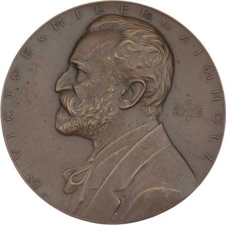 Dr.Victor von Miller zu Aichholz, numismatik - úmrtní medaile 1910 - poprsí zleva, vročení a opis, Sign., patinovaný jednostranný bronz 60 mm, Haus.7875
