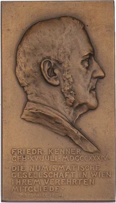 Friedrich Kenner, ředitel vídeň. Münzkabinetu - na 65.narozeniny 1899 - poprsí zprava, 6-řádkový nápis, Sign., patinovaný jednostr. bronz 35x63 mm, Haus.7513