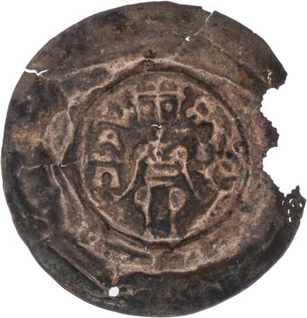 Brakteát český, Ca.770, F.XXVIII/4 (2113-2114), 0.733g, jedna větší a několik menších dírek, vylom. okraj, pomačkaný, pěkná patina RR!