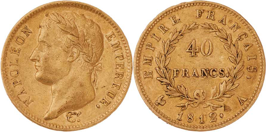 40 Frank 1812 A, KM.696.1 (Au900), 12.891g, dr.vada materiálu v reversu, nep.hr., nep.rysky, pěkná patina