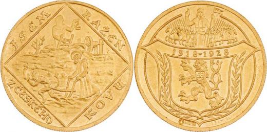 Španiel - čtyřdukátová medaile na 10 let ČSR 1928 - sv.Prokop orá s čertem, havíř / český lev, sv.Václav s rytíři, Sign., Punc., Au986, 28mm, 13.964g, nep.hr.