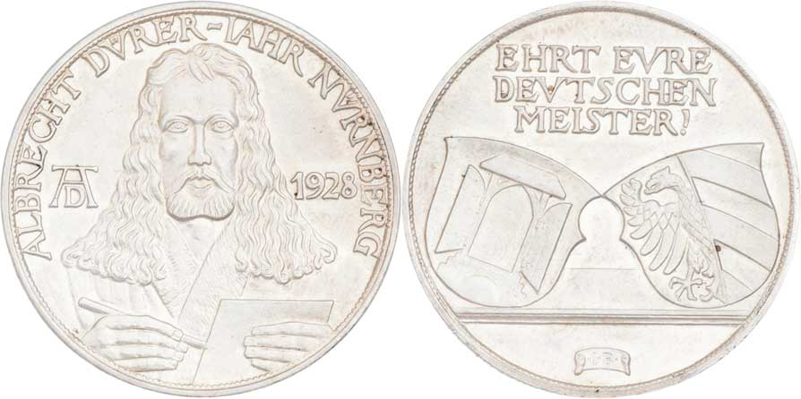 Sign.IB - Albrecht Dürer - 400 let úmrtí 1928 - poprsí zpředu, monogram, opis / dva znaky a nápis, Ag900, 36mm, 24.861g
