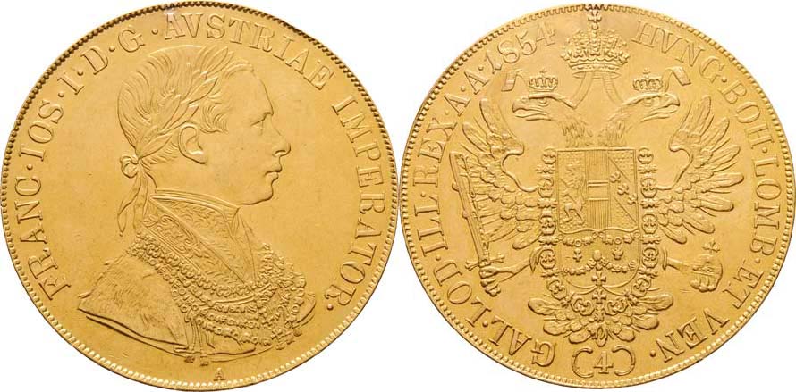 4 Dukát 1854 A, 13.857g, dobře opravená stopa po závěsu, nep.zvlněný, dr.hr., nep.rysky, pěkná patina RR!