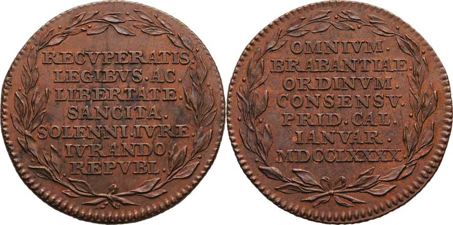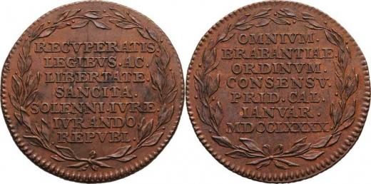 Brabantsko - AE jeton na vyhlášení samostatnosti 1790 - 7-řádkový nápis ve věnci/ 7-řádkový nápis ve věnci, měď 34mm, 13.038g, M.2195(AR), FW.II.11369, patina