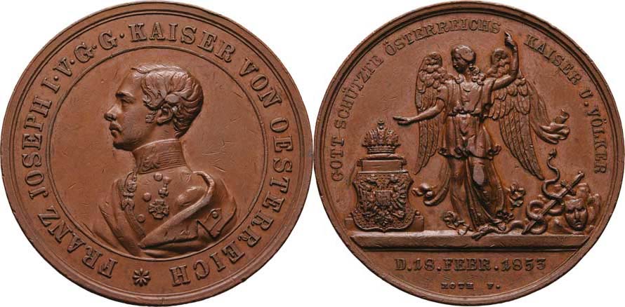 Roth - AE medaile na záchranu při atentátu 1853 - poprsí zleva, opis/ anděl strážný, znak, meč obtočený hadem, písmo, 38mm, 28.099g, H.3760(AR), M.2666, rys.