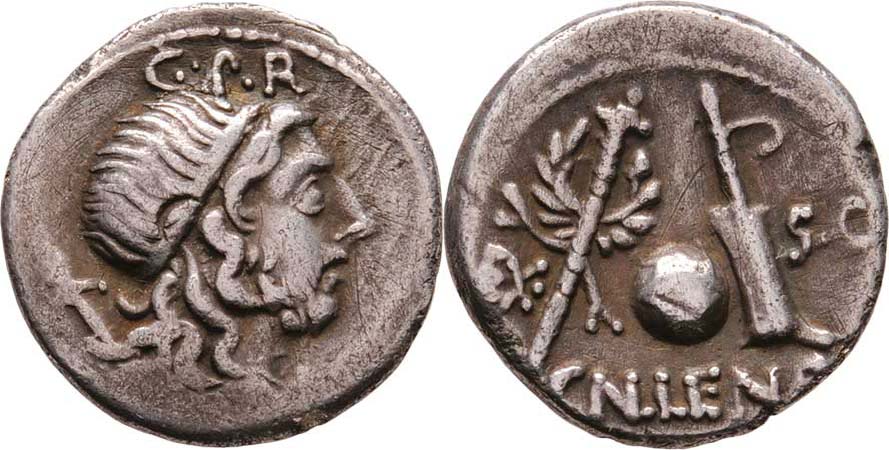 AR Denár, Hlava Genia zprava, náp."G.P.R." / globus mezi žezlem a kormidlem, nápis "CN.LEN.Q.EX.S.C.", Crawford.393/1a, Seaby.Cornelia.54, Alb.1288, nedor.