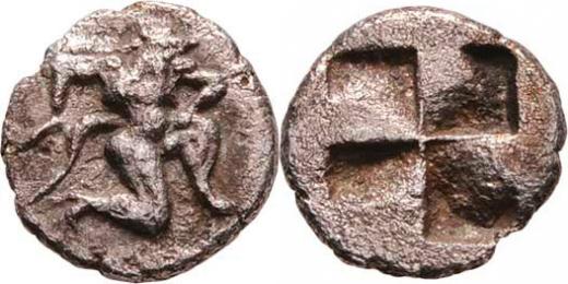 AR Trihemiobol, Satyr běžící doprava / inkusní čtverec, SG.neuvádí, 0.936g, nepravidelný okraj střížku, patina R!