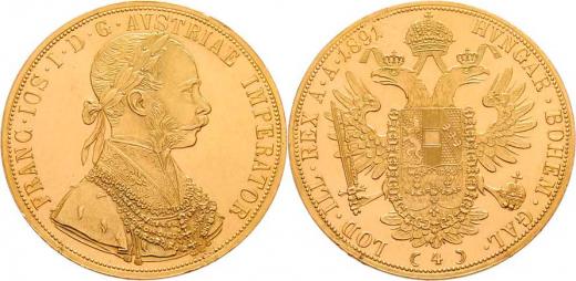 4 Dukát 1891 (pouze 54.000 ks), 13.956g, dr.hr., vl.rysky, pěkná patina, téměř R!