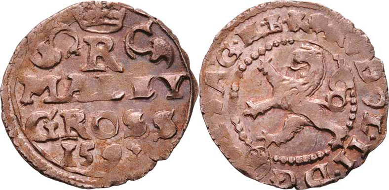 Malý groš 1593, K.Hora-Herold, HN.6 (opis 7a), nápis " MALEY / GROSS / 1593 ", 0.912g, nep.exc., nep.nedor., nep.dvojráz, pěkná patina