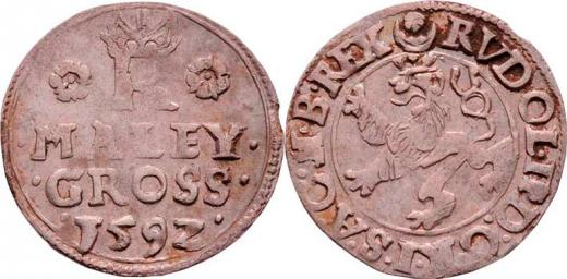 Malý groš 1592, Jáchymov-Hoffmann, HN.8b (opis 7c), nápis ". MALEY ./. GROSS ./. 1592 .", 0.710g, nep.nedor., patina