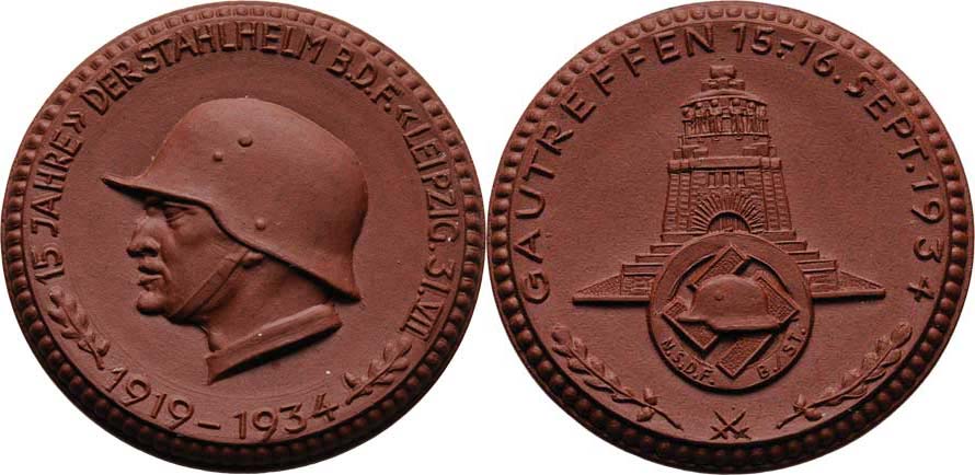 Lipsko 1935 - setkání na 15 let spolku Stahlhelm - voják v přilbě zleva, opis / památník u Lipska, znak, opis, míšeňský hnědý porcelán 37 mm