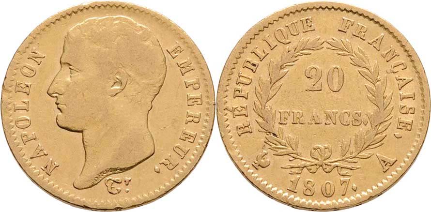 20 Frank 1807 A, Paříž, KM.A687.1 (Au900), 6.397g, dr.hr., nep.rysky