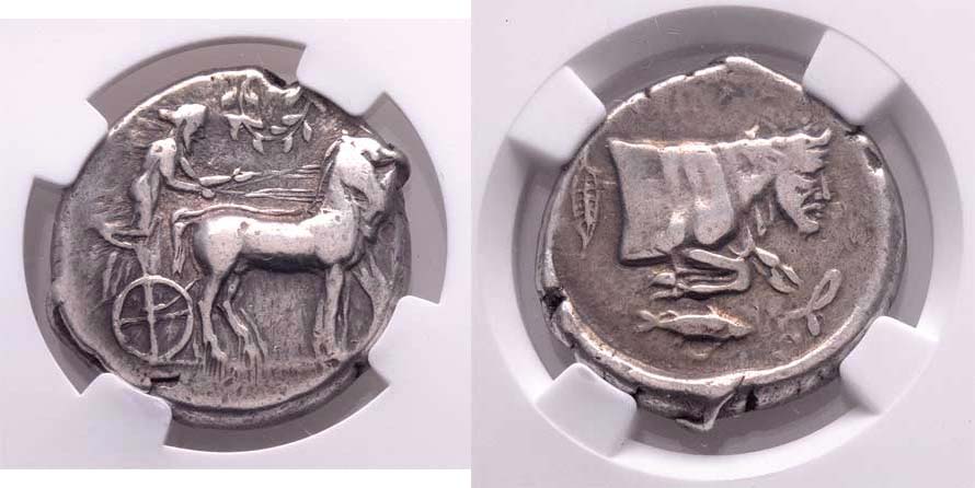 AR Tetradrachma, Protoma býka s lidskou hlavou zprava , list, ryba / vozataj s bigou zprava, věnec, jako SG.796, jako Ho.2.356, patina, zatavena v etui "NGC"