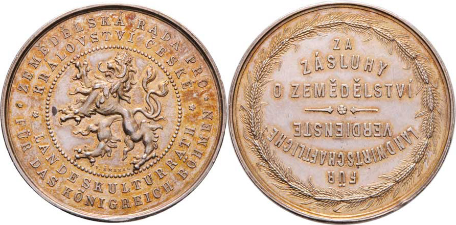 Šmakal - Zemědělská rada pro Království české b.l. - český lev, dvojitý opis / česko-němec. nápis ve věnci Sign., Ag800, 42mm, 23.895g, jako ŠFP.6b, hr., etue