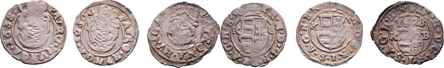 Denár 1628 KB, 1636 KB, 1638 KB, Hal.158, Husz.1204,1205, exc., nedor., patina 3ks
