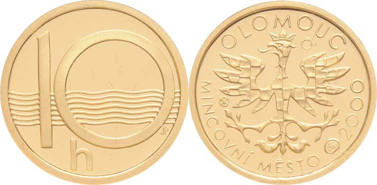 Prádler, Kartáková - mincovní město Olomouc 2000 - moravská orlice, opis / replika reversu desetihaléře, Au999, 16mm, (5.00g), kapsle, etue, karta