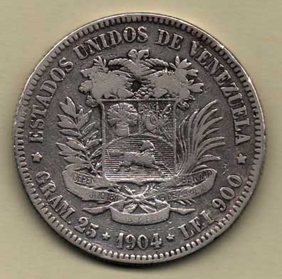 25 Gram (5 Bolivares) 1904, Y.24.2 (Ag900), 24.675g, dr.hr., rysky, patina