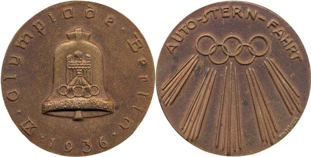 Otto Placsek - Berlín OH olympiáda 1936 Zvon s orlicí a olympijskými kruhy, opis / olympijské kruhy s paprsky, opis AUTO - STERN - FAHRT, Bronz 69 mm, 128,84 g_R!