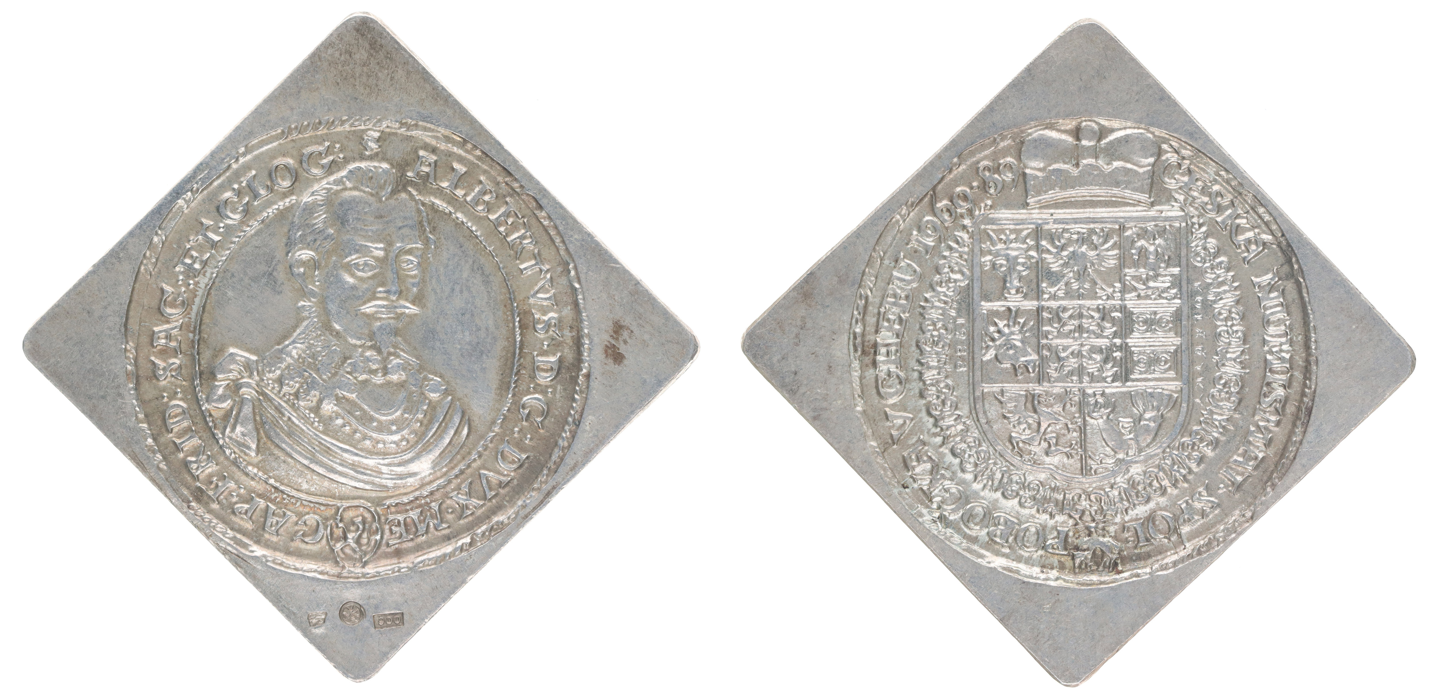 Z.Kolářský - 20 let pobočky ČNS v Chebu 1969 - 1989#Ag Poprsí vévody čelně mírně zprava, opis / velký znak s Řádem zlatého rouna, opis, Sign., Punc.0,900, Ag klipa 30x30 mm, 12,67 g náklad.300 ks, MF.A11/15a