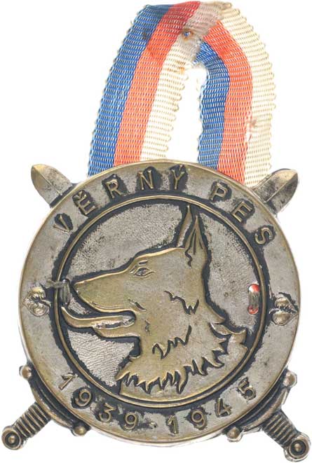 Odznak odbojové skupiny "Věrný pes" 1939 - 1945 (složená z obyvatel pražských čtvrtí Jinonice a Radlice) Dutý kruh.odznak z postř.plechu 40 mm, VM.VIa/230,vyobrazení VM.VIb/123_4 malé dírky k přišití + trikolora RR!