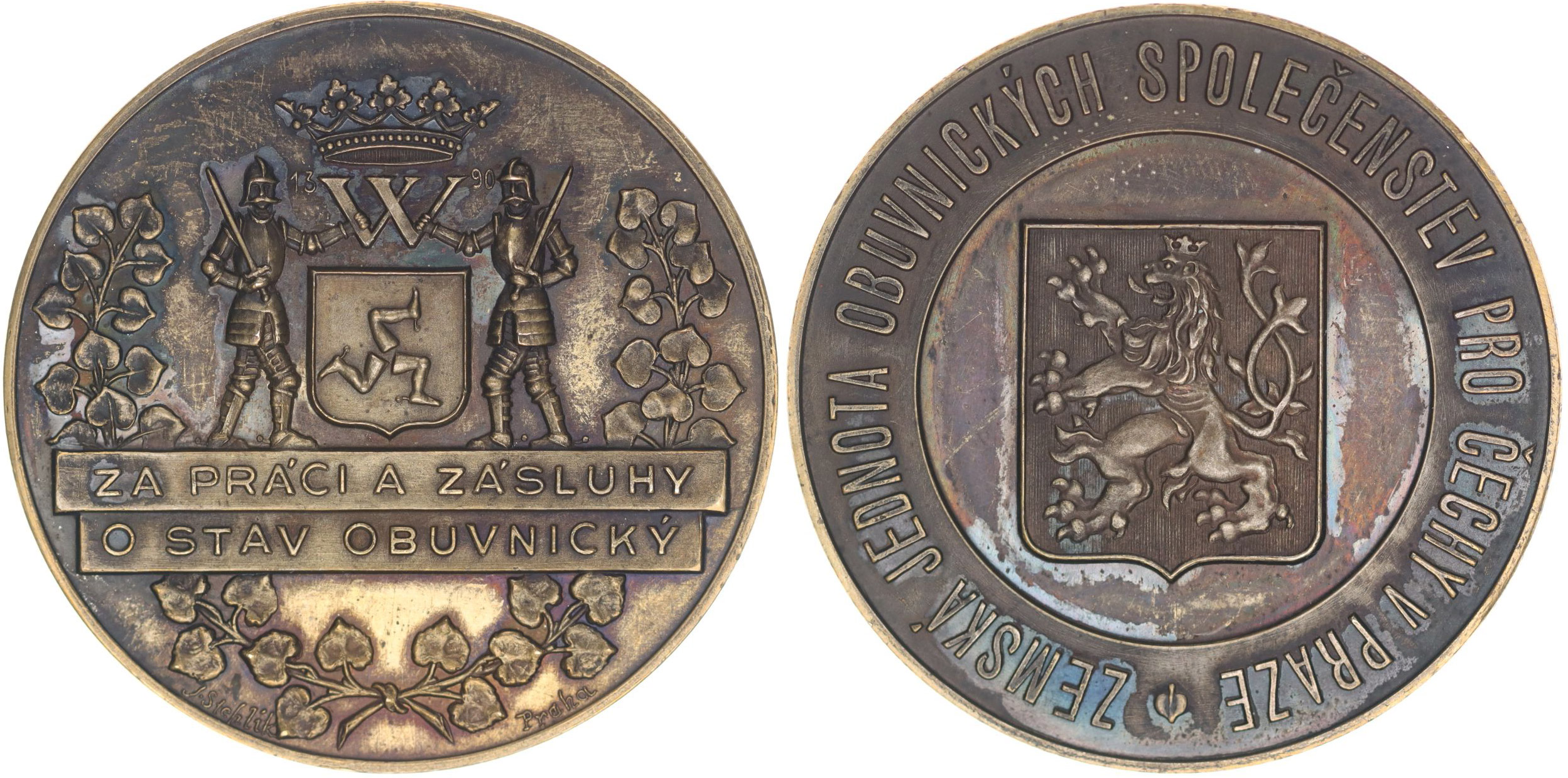 Zem. jednota obuvnických společenstev pro Čechy v Praze 2 rytíři drží W s korunkou 1390, opis / český znak ve věnci, Za práci a zásluhy o stav obuvnický, Sign., Bronz 42 mm_orig.etue