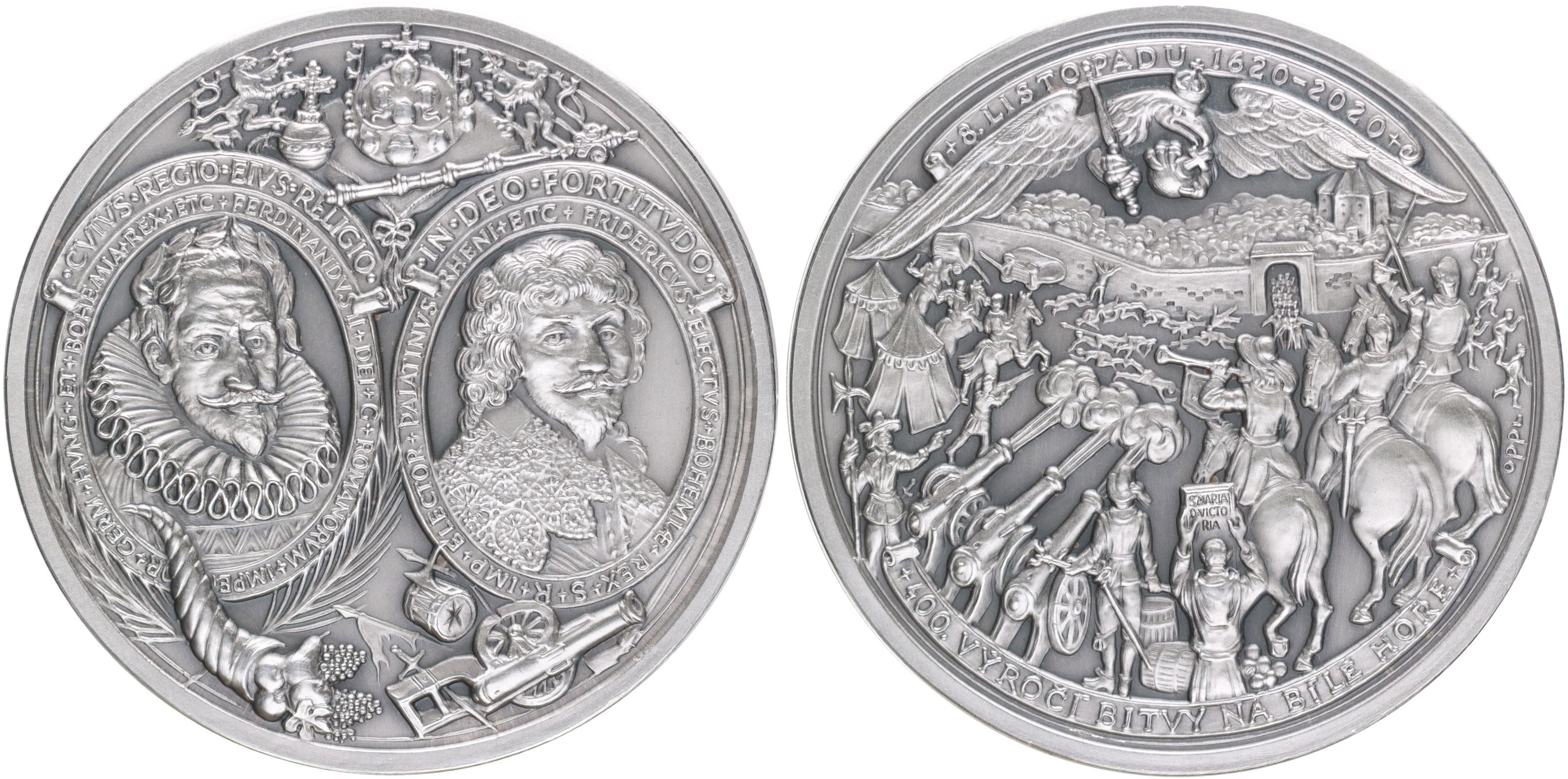 Medaile k 400.výročí bitvy na Bílé Hoře 8. listopadu 1620 Ve dvou medailonech Ferdinand II. a Fraidrich Falcký, zdobený okraj / bitevní scéna, opis, Sign., Punc.900, Ag 70 mm, 247,11 g nákl.60 ks_orig.repre etue s potiskem
