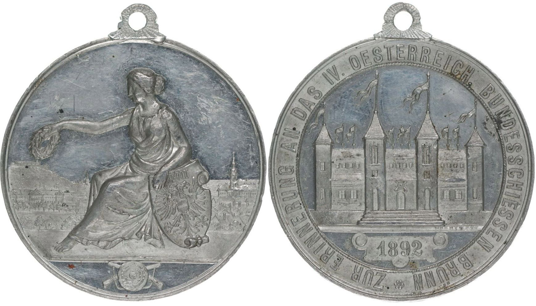 Brno - IV.rakouské spolkové střelby 1892 sedící alegorická postava ženy se znakem Moravy / pohled na budovu, opis Sign.Drentwett, Sn 37.5 mm, 18,76 g