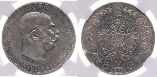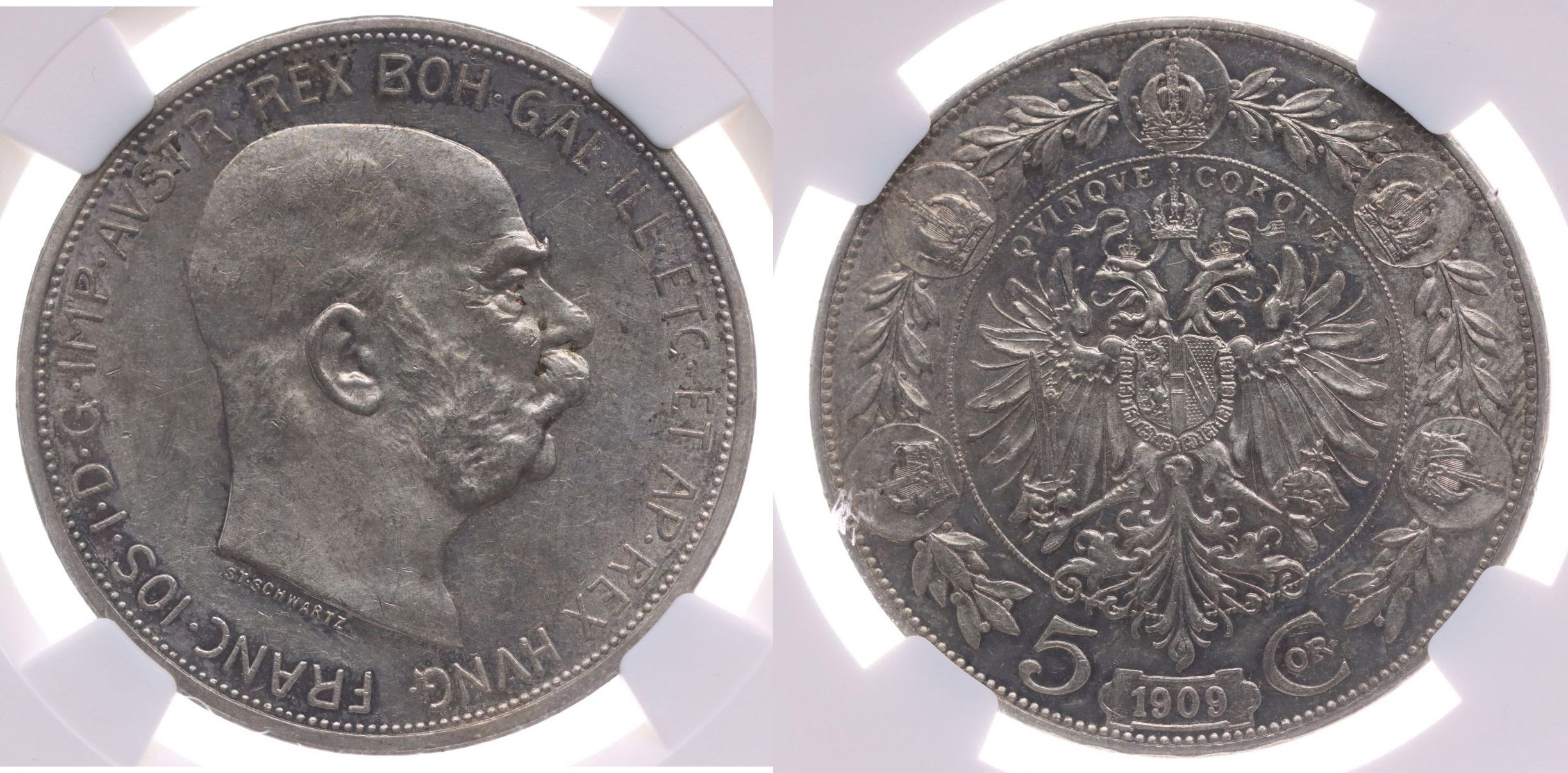 5 Koruna 1909 b.zn. Schwartz, znač. NGC: MS60