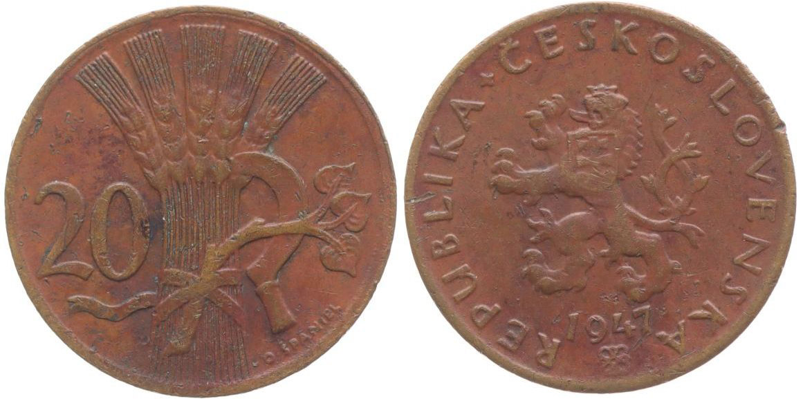 20 Haléř 1947_dr.hr. v av. a rev. R!