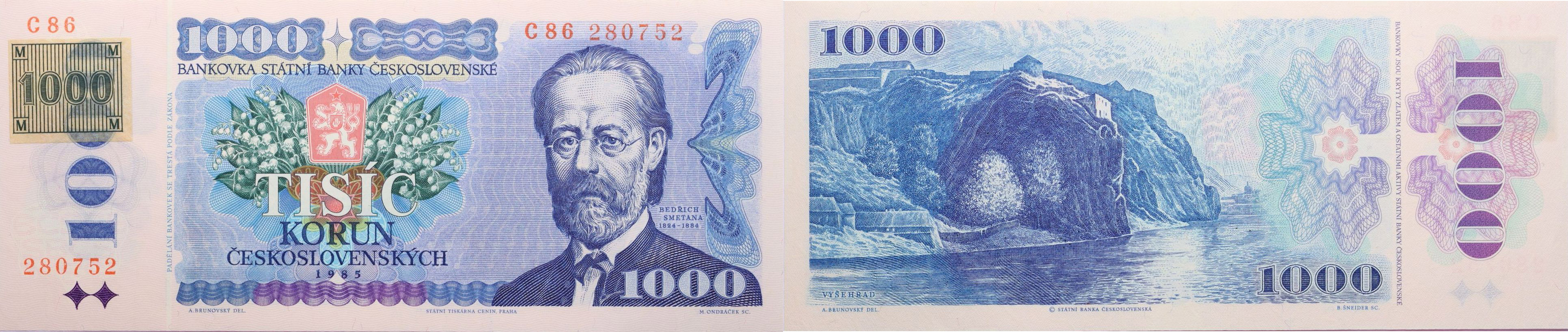 1000 Kčs 1985 - kolek lepený, sér.C86, B.CZ3a1, Hejz.CZ6b_"neperf."