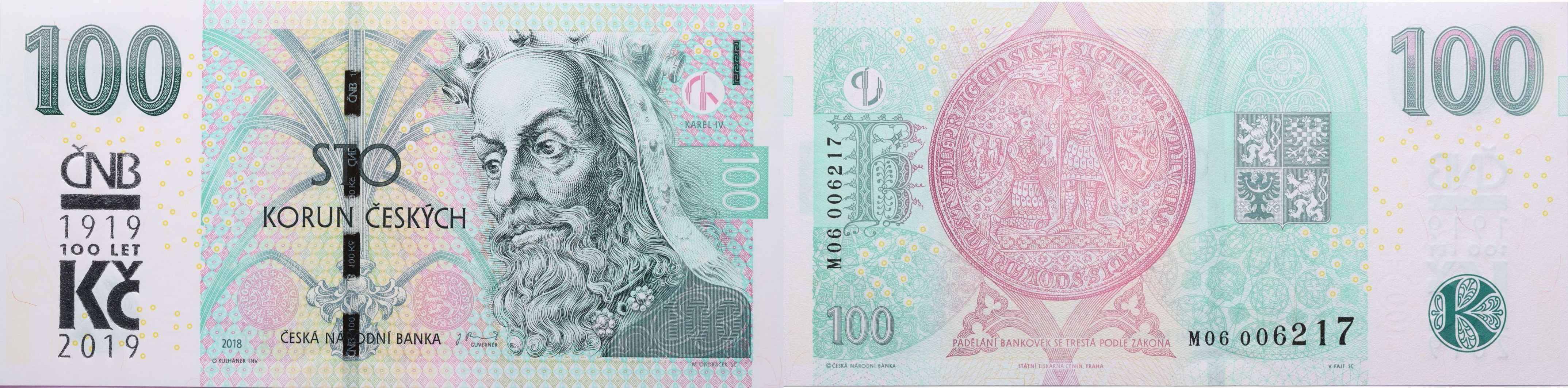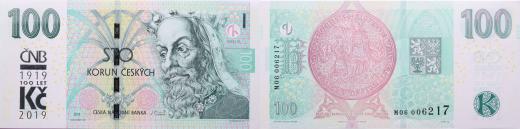 100 Kč 2018, sér.M06 s přítiskem ČNB 100 let Kč 1919-2019 He.CZ33a_"neperf."
