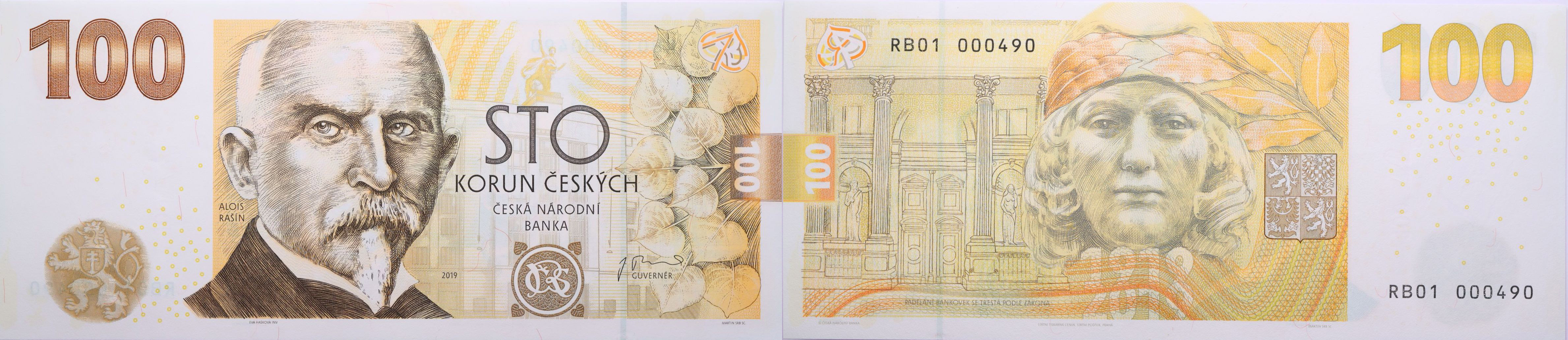 100 Kč 2019 A.Rašín ČNB, sér.RB01 000490_v pam.obalu s knížkou