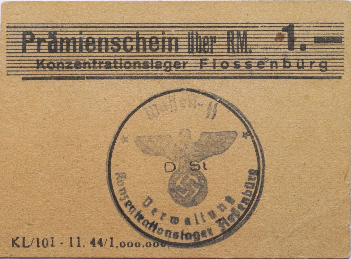 Flossenbürg - 1 RM 1944, razítko WAFFEN SS, světlehnědý papír