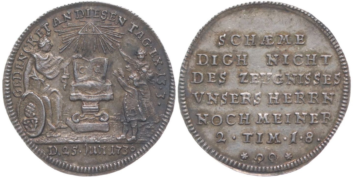 Nesign.- žeton (Ag odražek dukátu) k 200.výročí Augsburské konfese 25.6.1730, pod Božím okem dvě postavy s otevřenou knihou, opis / 7řádk.nápis, Ag 22,5 mm, Sch.33, Schnell.199, Forster.107_R!