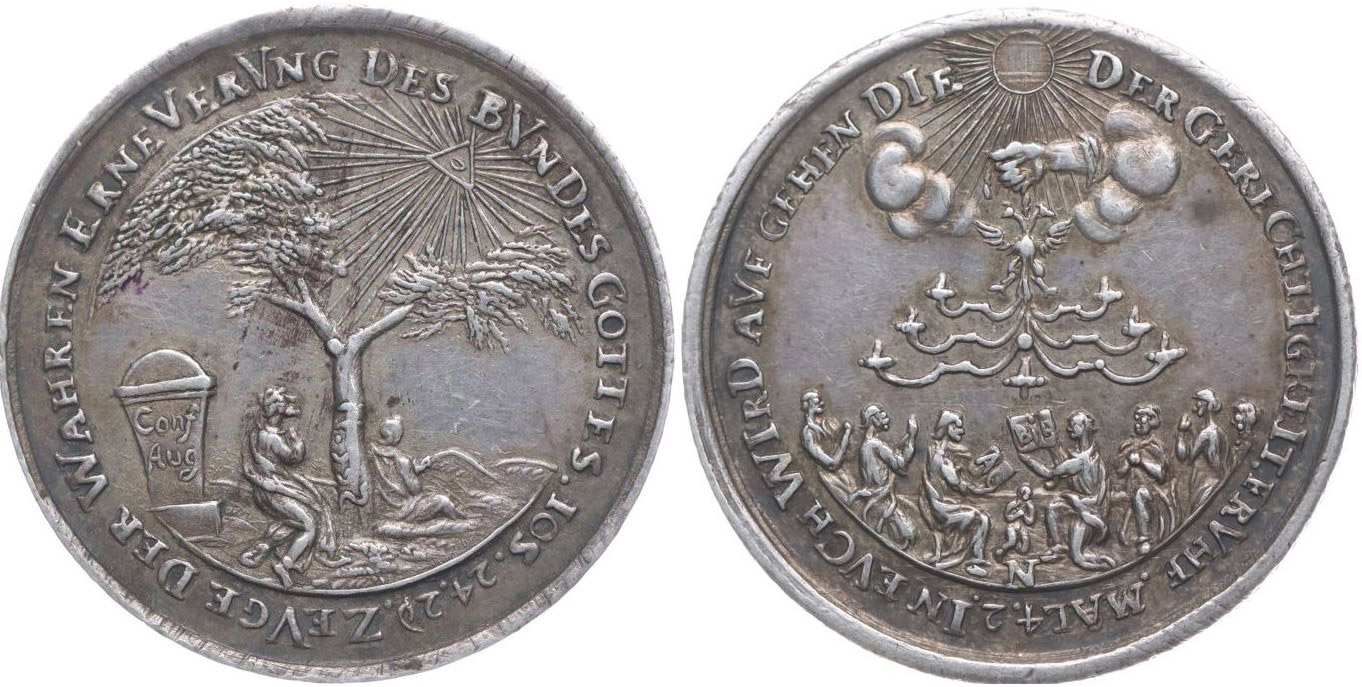 Nesign.- žeton (Ag odražek dukátu) k 200.výročí Augsburské konfese 1730, pod Božím okem postava pod stromem, opis / ruka z nebes nad sedmiramenným svícnem, opis, Ag 22 mm, Schnell.225, Forster.104_R!