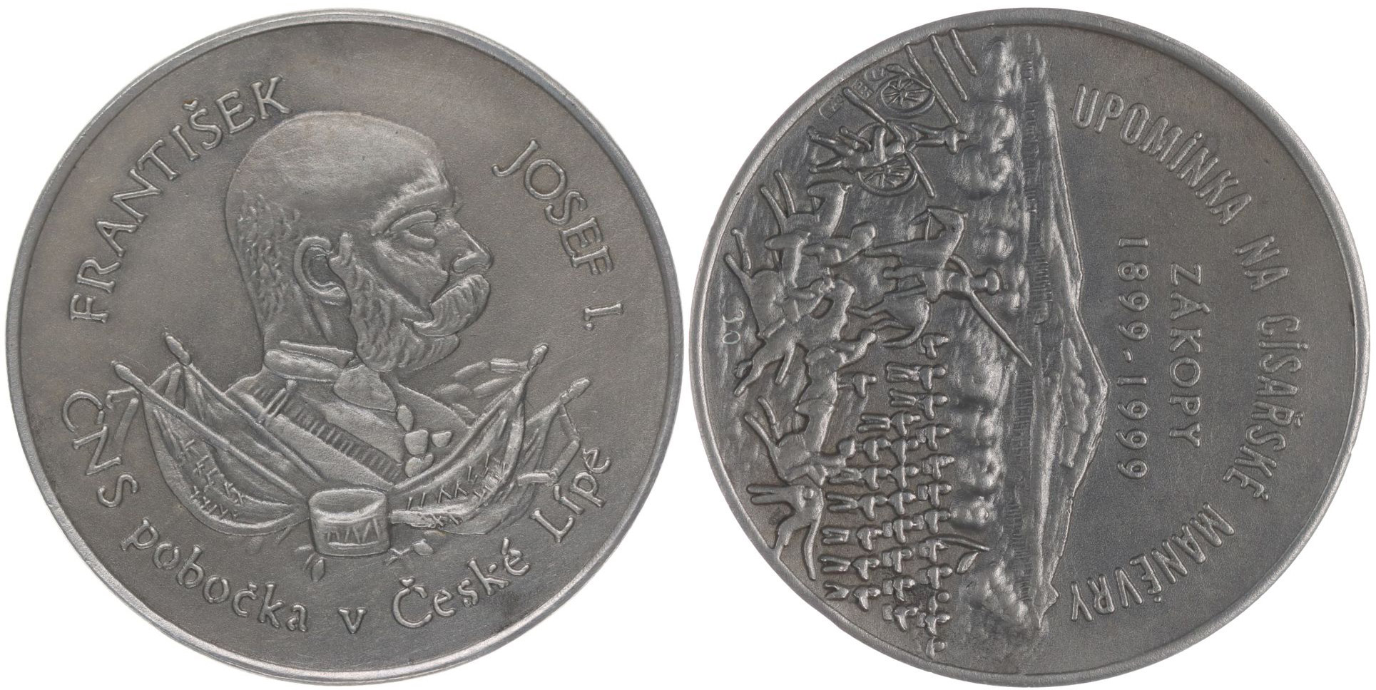 K.Lahoda - 100.výročí císařských manévrů v Zákupech, 1999 Poprsí císaře zprava, opis / vojenská scéna z manévrů, dvojitý nápis, opis, Punc. v rev., Ag 30 mm, 14,4 g, náklad 68 ks, MF.A4/4b, čís. 30 _certifikát