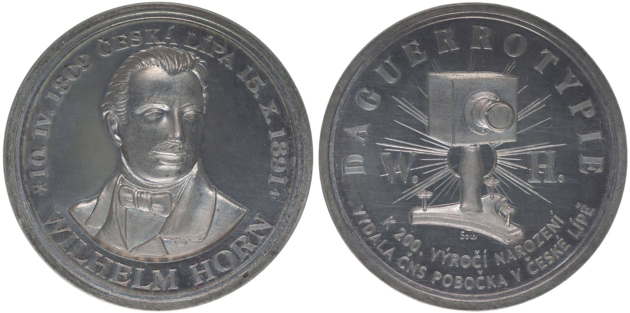 P.Soušek - Wilhelm Horn - k 200.výr.narození 1809 - 2009 Poprsí čelně mírně, opis / fotografický přístroj, opis DAGUERROTYPIE 2řádk.opis, Sign.Sou, Ag 40 mm, 38,6 g, náklad 30 ks, číslov. IV MF.A4/5c